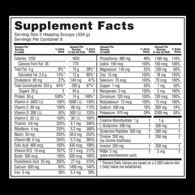 - 1,250 calorías por porción: Con una gran cantidad de calorías, Serious Mass cubre el gasto energético de atletas y culturistas, favoreciendo la ganancia de peso.
